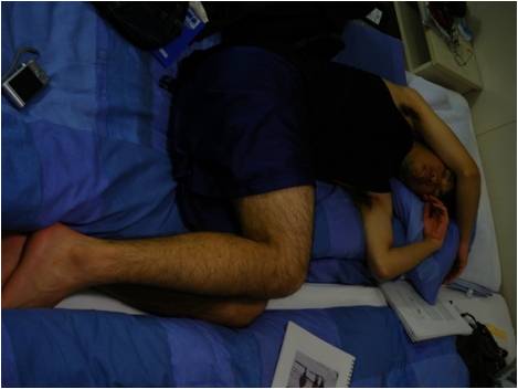 1日講義を受けた後、深夜に及ぶ連日のデータ解析の結果1人目の犠牲者。注)これはなんとなくベッドに見えなくもないが床です。なかなか解析を2日の突貫作業でやるというのは大変でした。