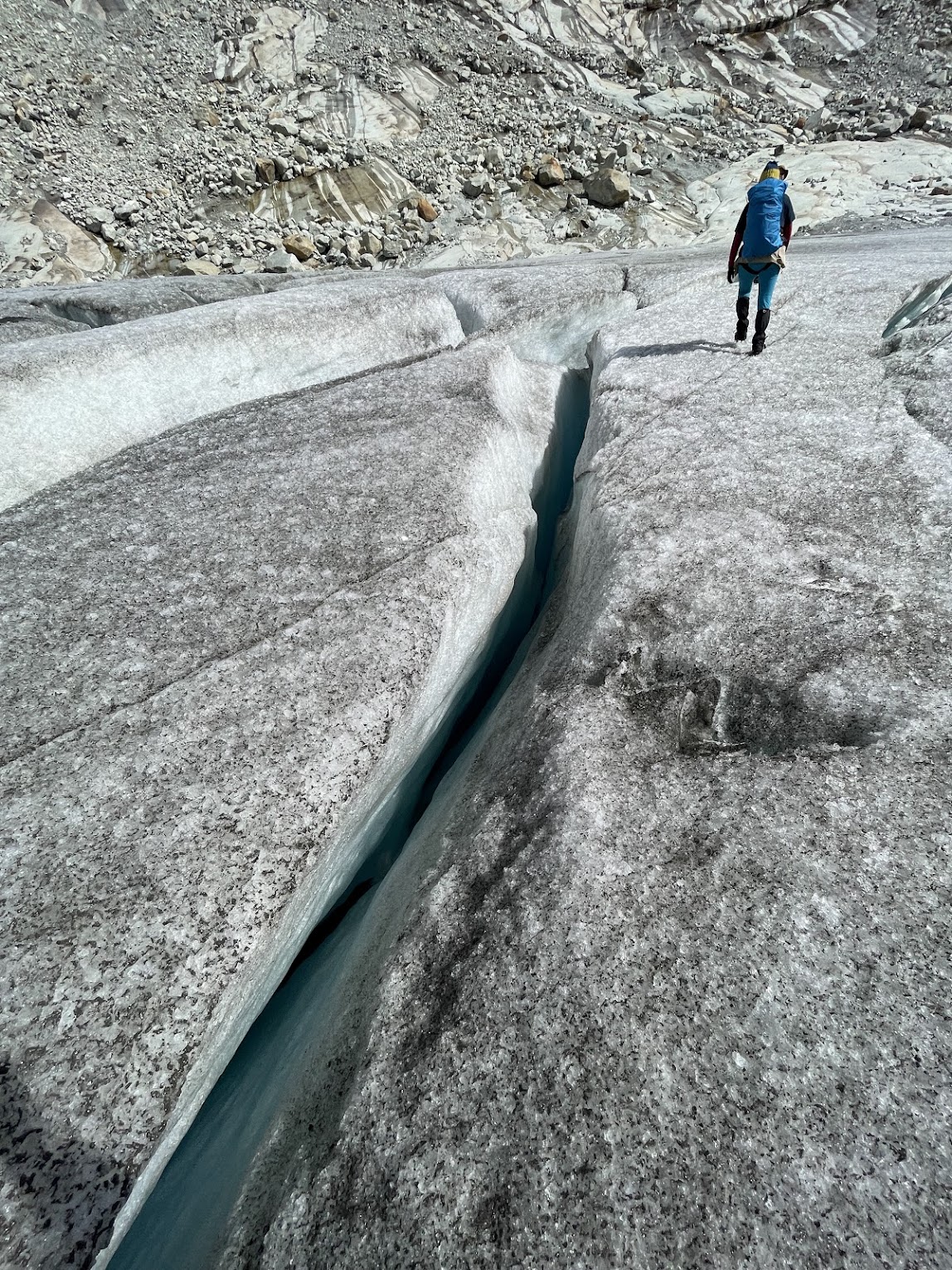 午後からはローヌ氷河上を歩きました。アイゼンの使い方やクレバスのわたり方はもちろん、クレバスに落ちた時の救助方法を確認しました。