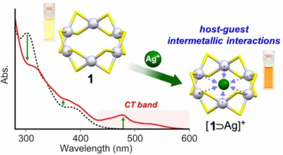 - The inclusion of a Ag+ ion by a hexanuclear platinum(II) thiolate macrocycle in solution was demonstrated, and the inclusion structure was determined by X- ray crystallography. Unique host−guest intermetallic interactions driven by charge transfer were elucidated by optical absorption spectroscopy and theoretical calculations.