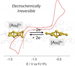 Electronic properties of ultrasmall gold clusters with defined nuclearity and geometrical structures have been a recent subject of interest not only with respect to the concept of molecularity but also because of their potential applicability as nanomaterials and catalysts. In this work, the electrochemical properties of dppp-protected octagold clusters ([Au8L4]n+ (L = dppp, n = 2 (1) and 4 (2), dppp = Ph2P(CH2)3PPh2) with charge-dependent geometrical structures were investigated. Unlike conventional sphere-like centered clusters held by multiple spokes, the non-spoked Au8 clusters displayed irreversible electrochemical profiles for the two-electron redox interconversion between 1 and 2, exhibiting a wide energy gap between the redox couples. This electrochemical irreversibility could be attributed to the significant alteration of electronic structures associated with the redox-coupled isomerization of the non-spoked cluster structures. In addition, we show that the coordinative interaction of Cl− anions with the Au8 clusters notably affects both reduction and oxidation courses, providing an example of coordination-coupled electron transfer events.