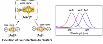 - A novel dodeca-ligated undecagold cluster having a nonagold core plus two exo-attached gold atoms was synthesized. Unlike the conventional icosahedron-based “core-only” isomer, the [9+2] cluster showed an intense visible absorption band. Theoretical calculation showed the involvement of the exo gold atoms in the generation of the unique electronic structure