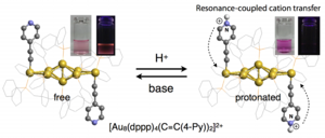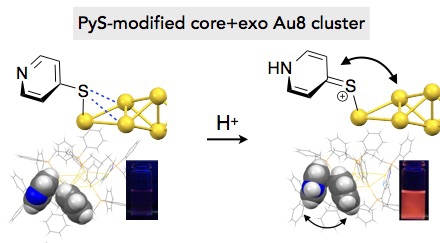- A series of [core+exo]-type Au8 clusters bearing two alkynyl ligands on the exo gold atoms ([Au8(dppp)4(C≡CR)2]2+, 2–6) were synthesized by the reaction of [Au8(dppp)4]2+ (1) with alkynyl anions. Although the C≡C moieties directly attached to the Au8 units did not affect the optical properties arising from intracluster transitions, the pyridylethynyl-bearing clusters (4–6) exhibited reversible visible absorption and photoluminescence responses to protonation/deprotonation events of the terminal pyridyl moieties. The chromism behaviors and proton-binding constants of these clusters were highly dependent on the relative position of the pyridine nitrogen atom, such that the 2-pyridyl (4) and 4-pyridyl (6) isomers showed more pronounced responses than the 3-pyridyl isomer (5). These results suggest that the resonance-coupled movement of the positive charge upon protonation is involved in the optical responses, where the formation of extended charged resonance structures causes significant perturbation effects on the electronic properties of the Au8 unit and also contributes to the high binding affinities.