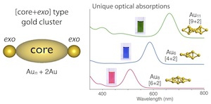 - Optical properties of [core+exo]-type gold clusters, which show an unusual isolated visible absorption, were studied from experimental/theoretical aspects. Through studies on three clusters of different nuclearity, we have shown the absorption properties are dependent on the cluster geometry rather than the nuclearity. Theoretical results indicated that, for all the clusters, the exo gold atoms are critically involved in the generation of the HOMO and LUMO bands responsible for the appearance of the visible absorptions.