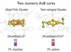 - A post-synthetic approach using a diphosphine ligand allowed the generation of two novel Au8 clusters with unique core geometries containing edge-shared gold tetrahedron motifs. These Au8 clusters with tetrahedron-based isomeric cores showed discrete absorption bands in the visible region to exhibit characteristic colors, and their optical properties were strictly dependent on the core geometries associated with the charge states.