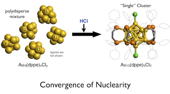 - A magic-number Au13 cluster with icosahedral geometry was exclusively generated from a polydisperse mixture of ultrasmall 1,2-bis(diphenylphosphino)ethane -coordinated gold clusters upon treatment with HCl, which acts as an efficient promoter.