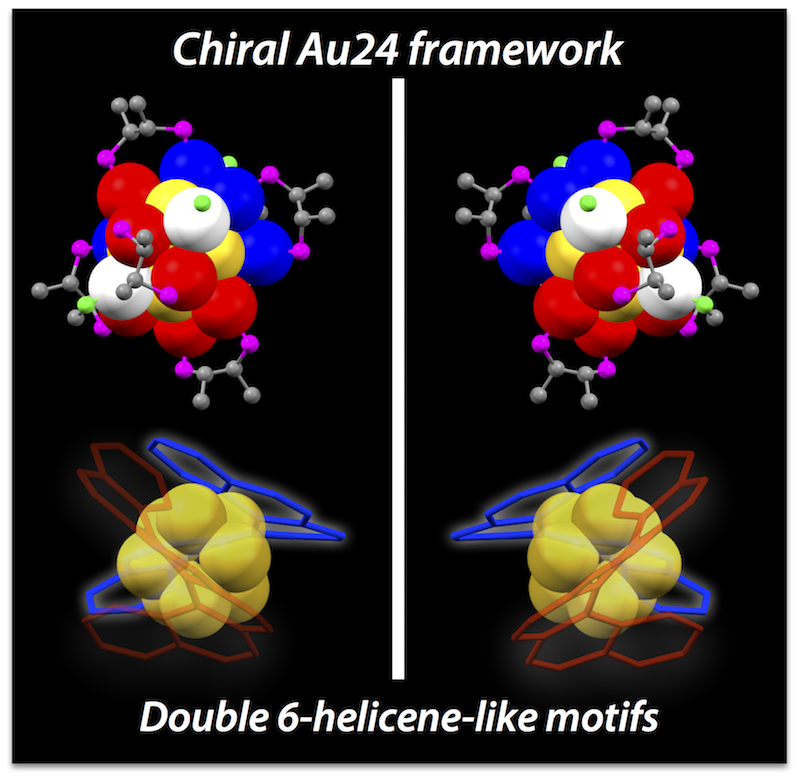 - Chiral gold clusters have attracted attention not only as a unique type of chiral compound but also in relation to the potential applications for chiroptical materials. Herein, we report the use of 2,3-bis(diphenylphosphino)butane enantiomers (chiraphos, L) as chiral auxiliaries results in the preferential formation of an unprecedented Au24 framework with inherent chirality. The crystal structure of [Au24L6Cl4]2+ (1) was revealed to have a square antiprism-like octagold core twinned by two helicene-like hexagold motifs, where the inherent chirality is associated with the helical arrangement. The clusters carrying (R,R)- and (S,S)- diphosphines had right- and left-handed strands, respectively. Circular dichroism spectra showed peaks in the visible to near-IR region, some of which did not coincide with absorption bands, suggesting the enantiomeric Au24 frameworks possess unique chiroptical properties. The Au24 frameworks were highly robust against thermal treatment, which could be attributed to the superatomic concept (18 e– system) and the steric constraint effects of the bridging ligand units. This work will offer novel insight into the unique properties of inherently chiral gold clusters.