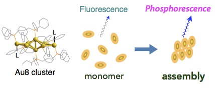 - Aggregation-induced optical responses are ubiquitous among a wide range of organic and inorganic compounds. Here, we demonstrate an unprecedented effect of aggregation on the photoluminescence (PL) profiles of [core + exo]-type [Au8]4+ clusters, which displayed a change in the dominant PL emission mode from fluorescence to phosphorescence-type upon aggregation. In solvents in which cluster molecules are highly soluble and exist as monomers, they displayed single PL bands at ∼600 nm at ambient temperatures. However, in solvents in which cluster molecules are less soluble and cluster aggregation is induced, a new PL band at ∼700 nm also emerged. Lifetime measurements revealed that the PL emissions at ∼600 and ∼700 nm had fluorescence and phosphorescence characters, respectively. Studies of the excitation spectra suggested that organized cluster assemblies were responsible for the lower-energy emission at ∼700 nm and had exceptionally high emission activity. Accordingly, intense phosphorescence-type emissions were observed in the solid state in which the quantum efficiencies were higher by two orders of magnitude than those of the corresponding monomeric forms in solution. This work provides an example of the critical effects of cluster aggregation events on their optical properties and shows the potential of such effects in the design of cluster- based materials with unique functions and properties.