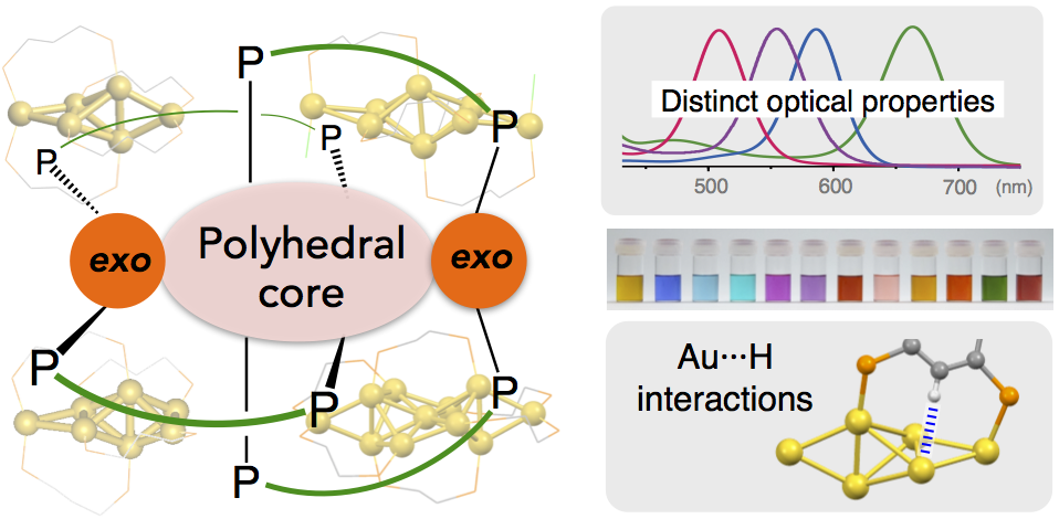 - Over recent years, research on the structures and properties of ligand-protected gold cluster molecules hasgained significant interest. The crystal structure informationaccumulated to date has revealed the structural preference toadopt closed polyhedral geometries, but the use of multidentateligands sometimes leads to the formation of exceptional structures.This Account describes results of our studies on diphosphine-coordinated [core+exo]-type gold clusters featuring extra goldatoms outside the polyhedral cores, highlighting (1) their distinctoptical properties due to the unique electronic structuresgenerated by the exo gold atoms and (2) electronic/attractiveligand−cluster interactions that cause definite perturbation effects on the cluster properties.