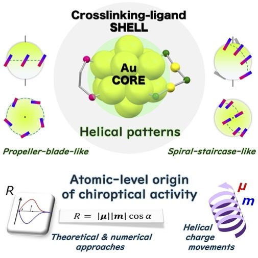 - The geometric diversity of ligand-protected metal clusters has greatly provoked the interest in the chirality of gold clusters bearing crosslinking ligands, which are a subject of active investigations. This review introduces recent geo- metric and computational studies on chiral gold clusters whose metal core is covered by intramolecular crosslinking moieties. Following an overview of the structural construc- tions, the geometric features of the ligand shells and metal cores of chiral gold clusters are elucidated, where anemphasis is placed on the importance of helical patterns of the crosslinking ligands arranged around the gold cores. In addition, insights into the atomic-level origin of chiroptical activity, which cannot be accessed solely through experi- ments, are presented from computational studies using numerical and theoretical approaches, thereby providing a novel methodology based on transition-moment and tran- sition-density analyses.