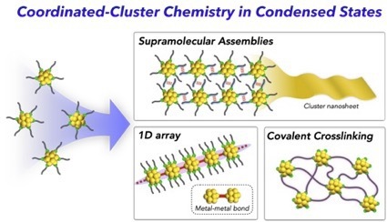 - Coordinated metal clusters composed of a defined metal core and surrounding ligands, as known as atomically precise ligand-protected clusters, have attracted attention because of unique structural fea- tures and properties. Aside from the rapid progress in the research exploring new clusters and elucidating the structure–property relationship at the single-molecule level, interests in the behaviors of the clusters in condensed states have recently emerged. In this review, we focus recent topics on such assembled coordinated metal clusters. First, examples of supramolecular-type assemblies using directional inter- molecular forces are presented, highlighting the emergence of unique nanoscale morphologies. We also show J-aggregate-like or AIE (aggregation-induced emission)-type behaviors associated with the forma- tion of ordered cluster assemblies and crystal polymorph-dependent photoluminescence properties. In addition, recent works concerning 1D cluster arrays bridged by metal–metal bonds and covalently cross- linked multi-cluster systems are shown as the examples of bonded cluster multimers. These examples would provide insights into the rational strategies to construct multi-cluster systems that exhibit unique structures, functions, and properties due to the synergetic effects among the cluster components.