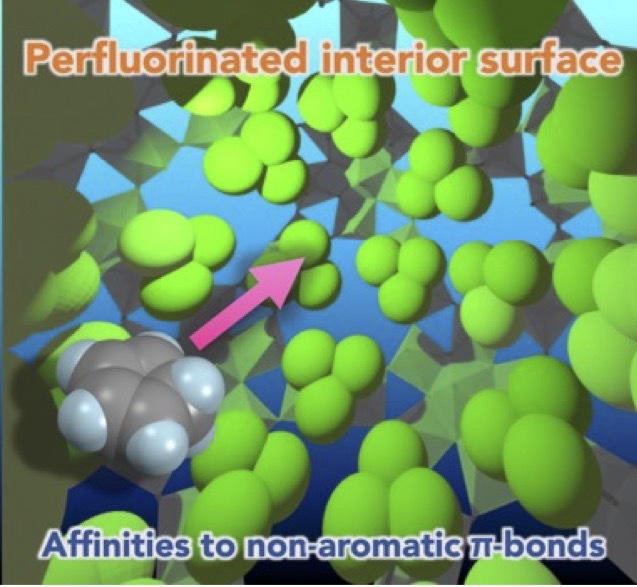 ([Mo132O372(OCOR)30(H2O)72]42-) leads to the emergence of unique guest binding activities inencapsulation. Prominently, the trifluoroacetate-modified cage (R = CF3, 2) having as many as 90 F groups inside favors to trap cyclopentadiene (Cp), which is hardly trapped by the non-fluorinated counterpart (R = CH3, 1). Systematic studies using related hydrocarbons show that the amount of the encapsulated guest is correlated with the unsaturation degree of the guests, implying the involvement of the attractive interaction of the CF3-modified interior wall with the guest π-electron clouds. Control experiments using the semi-fluorinated analogues (R = CF2H, CFH2) reveal that the perfluorination is a critical factor to facilitate the Cp encapsulation by 2, indicating that collective effects of polar C-F bonds spreading over the interior surface, rather than the polarity of the individual C-F bonds, are responsible. We also provide a successful example of the physical molecular confinement within the cage through the “ship-in-a-bottle” Diels-Alder reaction between trapped diene and dienophile.