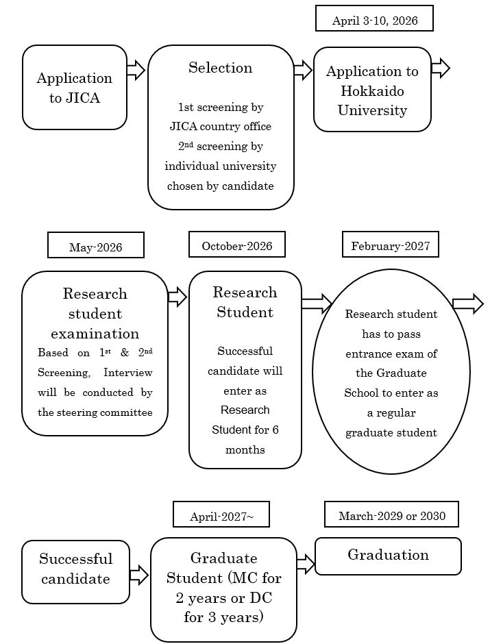Applicants are screened by JICA, and the candidates selected by JICA will take a research student examination of Graduate School of Environmental Science, Hokkaido University. Successful candidates will join the Graduate School of Environmental Science as research students in October 2026 and will take an entrance examination for our master’s or doctoral program in February 2027. Those who pass the entrance exam will start the two-year master’s program or three-year doctoral program in April 2027.